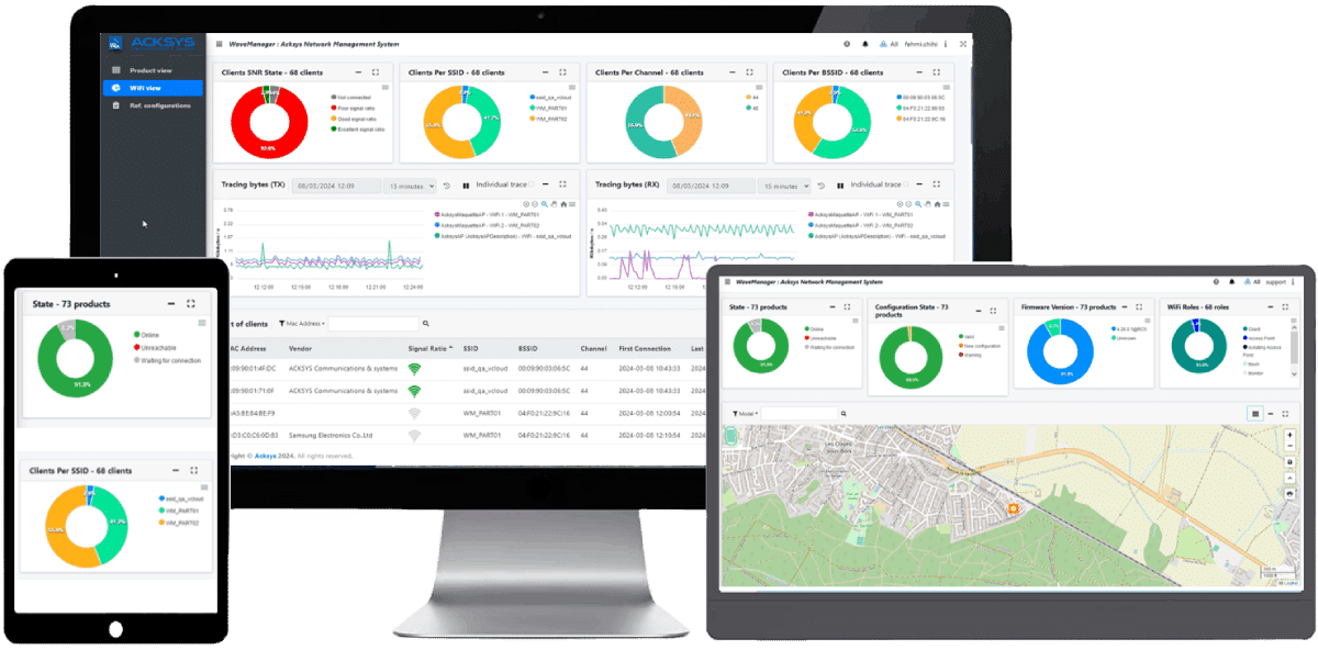 Avec un roaming proche de 0ms et une perte de paquets inférieure à 0.1%, les débits sont très importants et la communication de très bonne qualité. Cette solution exige des AP ACKSYS double radio à bord (mode client) et peut fonctionner avec des AP au sol ACKSYS ou d’autres constructeurs. Cette solution a été déployée avec succès sur de nombreuses lignes de métro.