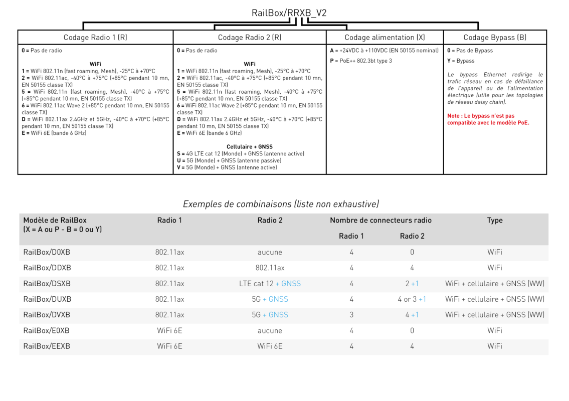 | RailBox/RRXB_V2 | Simple ou double point d’accès WiFi ou passerelle LTE-A ou 5G pour applications ferroviaires et mobiles, livré avec une plaque de fixation (déjà montée). |