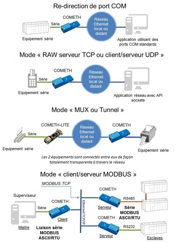 Les produits de la gamme COMETH permettent d’accéder à tout périphérique série depuis des stations Windows, Unix & Linux connecté à votre réseau Ethernet TCP/IP, de relier deux périphériques série distants au travers du réseau ou encore bien de réaliser une passerelle Ethernet / MODBUS.