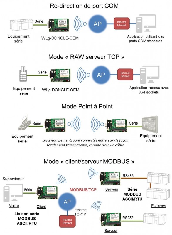 Le WLg-DONGLE-OEM est également étudié pour fonctionner comme une passerelle MODBUS ASCII/RTU vers le réseau industriel MOBDUS/TCP, permettant ainsi de connecter tout équipement MODBUS série au réseau radio.