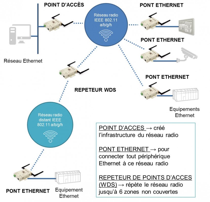 WLg-LINK utilisé comme « Point d’accès » est la brique de base d’un réseau Ethernet sans fil WiFi industriel, dans son mode « Bridge », il permet de connecter n’importe quel équipement industriel disposant d’une interface Ethernet à ce réseau sans fil.