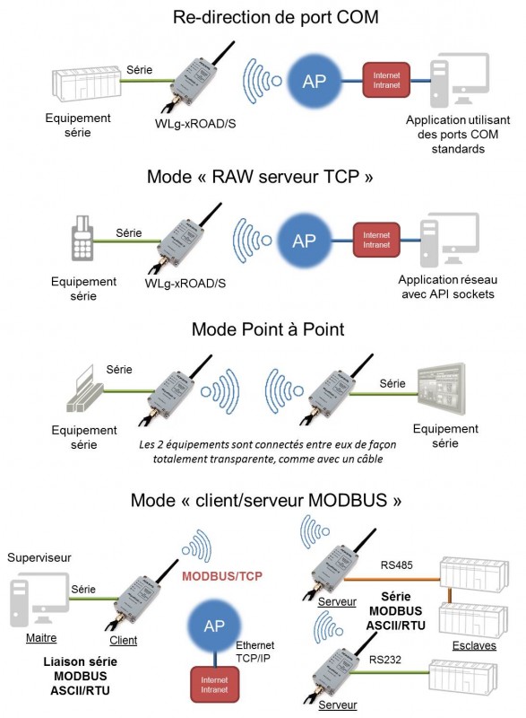 Support des modes Client/serveur TCP, Client DHCP, Extension TELNET RFC221, Serveur Telnet, re-directeur de ports COM (VIP), Lien série virtuel multipoint ou point-à-point par UDP et des protocoles Client/serveur MODBUS/TCP, MODBUS/RTU & MODBUS/ASCII, communication directe (ad hoc) ou par point d’accès