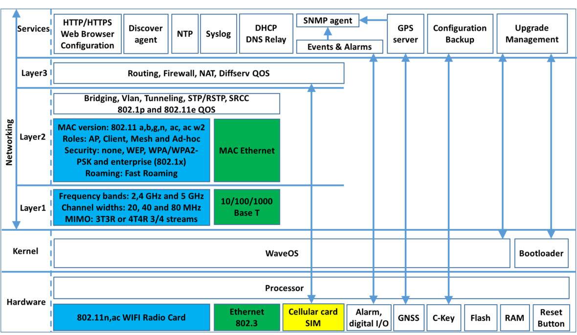 WaveOS est le système d’exploitation universel de tous les produits communicants sans-fil ACKSYS offrant une interface web conviviale pour configurer les divers réseaux d’accès (WiFi, LTE, Ethernet), les fonctionnalités réseaux (VLAN, routage, VPN, pare-feu…) et différents types de services (DHCP, DNS, SNTP, SNMP…). Grâce aux nombreuses années d’expérience qu’ACKSYS a acquises dans la conception de produits utilisés dans les applications industrielles, WaveOS s’est enrichi de nombreuses fonctionnalités de commutation et de routage qui permettent de créer des réseaux industriels simples ou complexes, selon les besoins de ses clients. En standardisant son portfolio de produits sans fil avec un seul système d’exploitation, ACKSYS offre une simplification d’installation, d’exploitation et de maintenance d’appareils isolés ou intégrés dans des réseaux complets. Ainsi, une fois qu’un utilisateur s’est familiarisé avec un produit ACKSYS, ses connaissances peuvent être facilement réutilisées avec les autres produits de la gamme sans-fil ACKSYS.